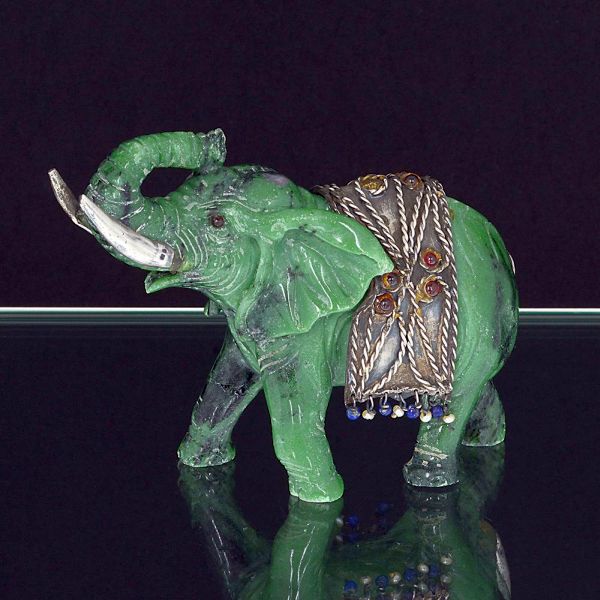 • <b>LUIZ FERREIRA</b> - Escultura em jade representando elefante oriental. Presas e manto montado em prata. Aplicações em "cabochons". O elefante traz o simbolismo de boa sorte, sabedoria, persistência e determinação e apresenta forte relação com o budismo e hinduísmo. Contraste da prata da cidade do Porto, 833 ml e punção do referido ourives. Alt. 10.5 cm; Compr. 14,5 cm