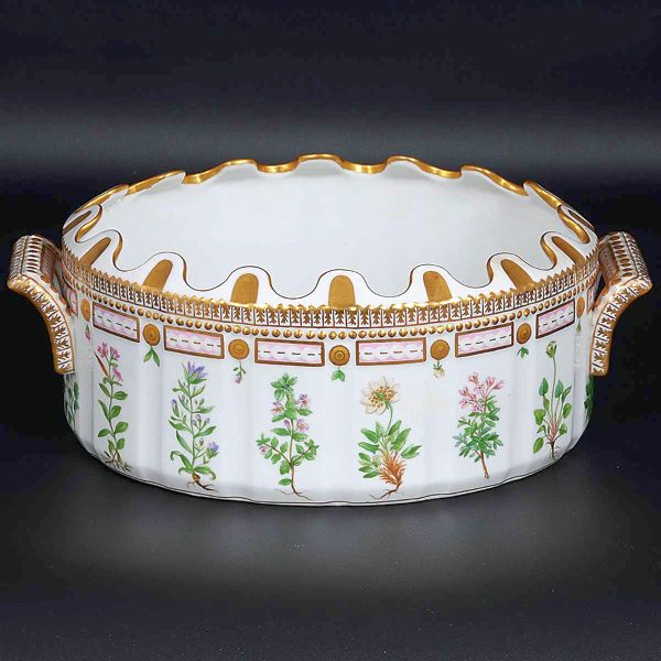 • Excepcional "<b>rafraîchissoir</b>" oval de borda ondulada em porcelana dinamarquesa da importante manufatura Royal Copenhagen modelo "Flora Danica". Inteiramente pintada à mão em belíssima policromia com suas designações botânicas e numeração no verso. Apresenta borda em mínimos picotados cobertos a folha de ouro. Med. 33 x 23 cm