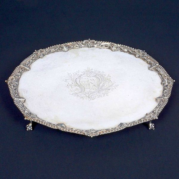 • Belíssima <b>salva </b>circular em prata inglesa George III. Centro apresentando belo brasão de armas e borda levemente movimentada com gomos, "coquilles" e acantos. Pés em garras sobre bolas. Contrastes da cidade de Londres de 1782 e marca da prateira ELIZABETH JONES. Diâm. 46,5 cm. Peso 2380 gramas.
