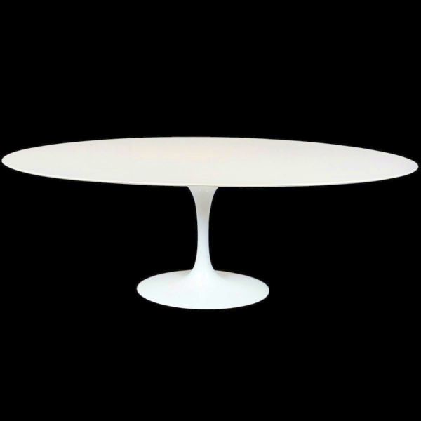• <b>EERO SAARINEN </b>- Mesa oval "Saarinen" com tampo em mármore branco e base na forma de tulipa em alumínio fundido com pintura automotiva da mesma cor. Med. 75 x 214 x 109 cm