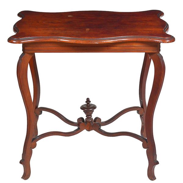 • Antiga <b>mesa auxiliar </b>em madeira nobre. Apresenta tampo, pernas e amarração inferior em ondulações centralizando elemento em forma de pião. Med. 75 x 80 x 64 cm