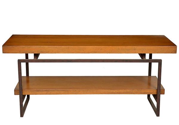 • Belo <b>aparador </b>de forma retangular, europeu, em madeira clara, com dois "plateaux" montados em suporte metálico. Década de 60. Med. 81 x 181 x 61 cm